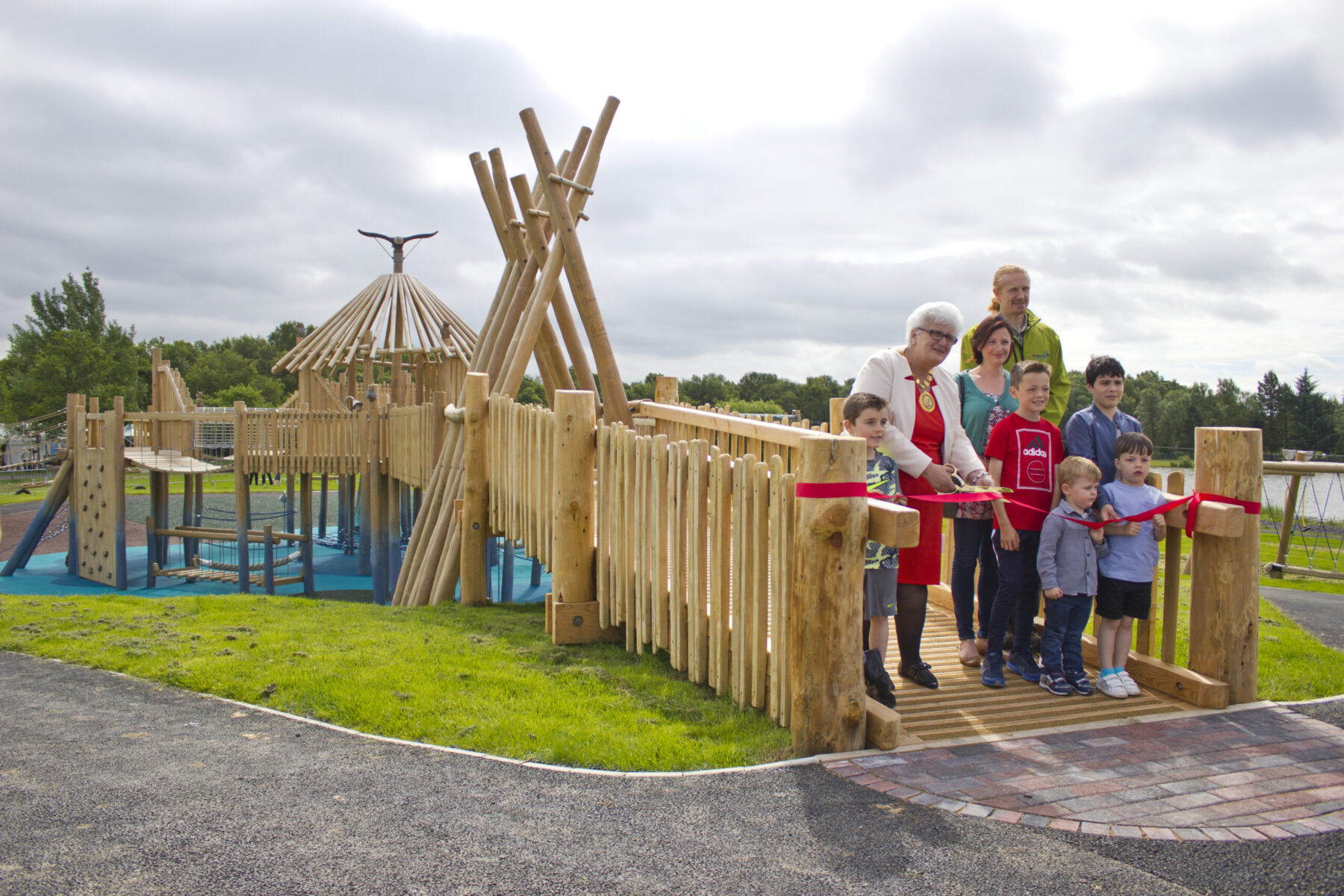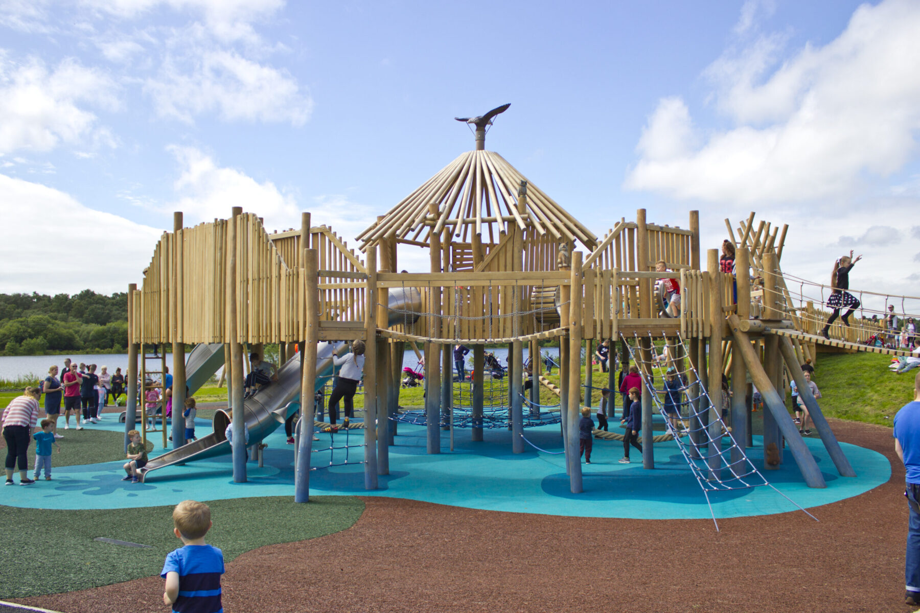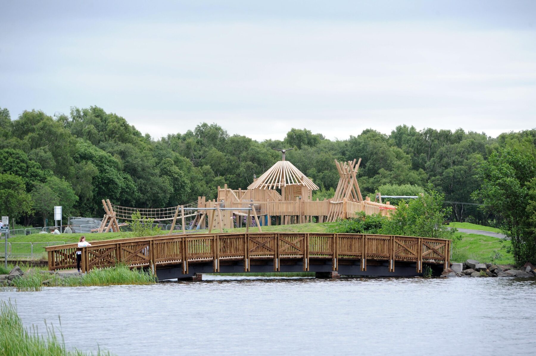 This play area was an important, “flagship” project, part of the national Seven Lochs initiative. The first major part of the £6.8 million initiative to go to construction and as such quality and programming was paramount. The project involved the construction of a prominent bespoke ‘Crannog’ multi-play facility, plus a number of additional robinia timber play items and auxiliary furniture. A new pathway network was installed around the park with associated safety surfacing at all items of play equipment.