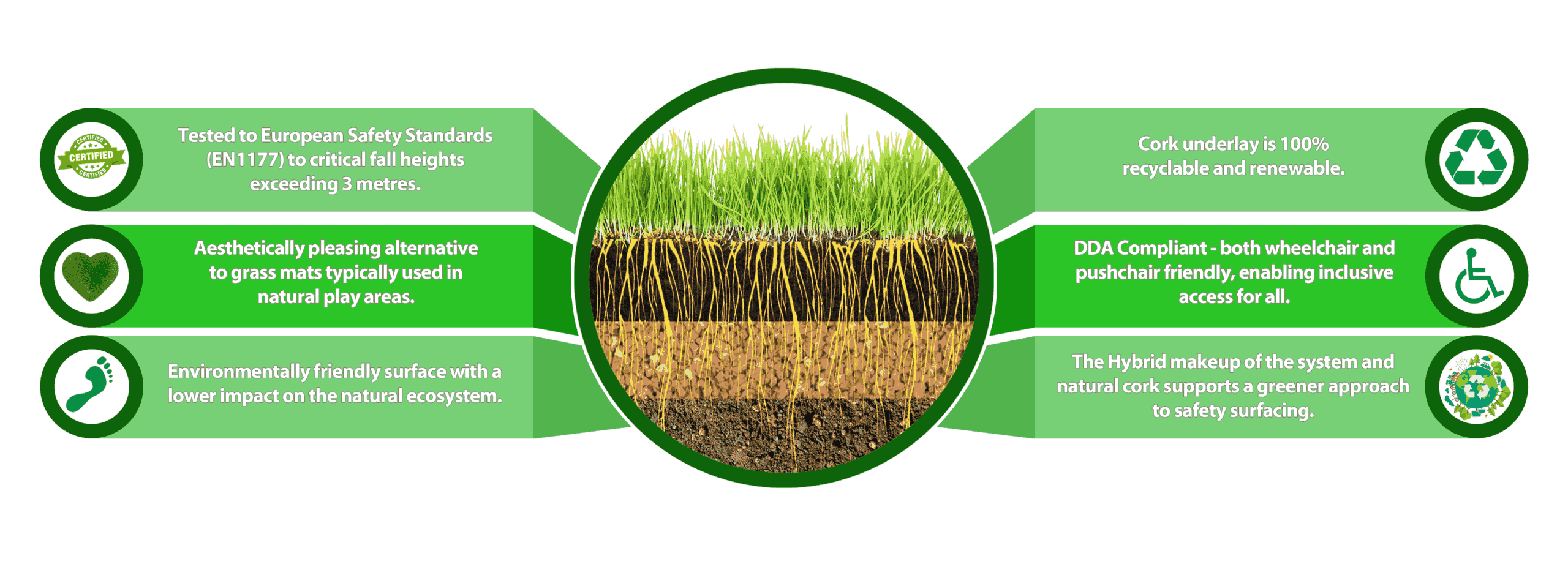 The EN1177 standards are based on the statistical analysis of head injuries and are used to determine the depth of safety surfacing. Tumble Turf has been independently tested to EN1177 standards in a range of varying depths, catering for different critical fall heights (CFH).